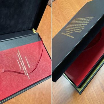 We offer custom foil stamping and personalisation for books, covers, boxes, and special projects. From names and titles to bespoke designs, we add a refined and professional finishing touch to both modern and heritage pieces.